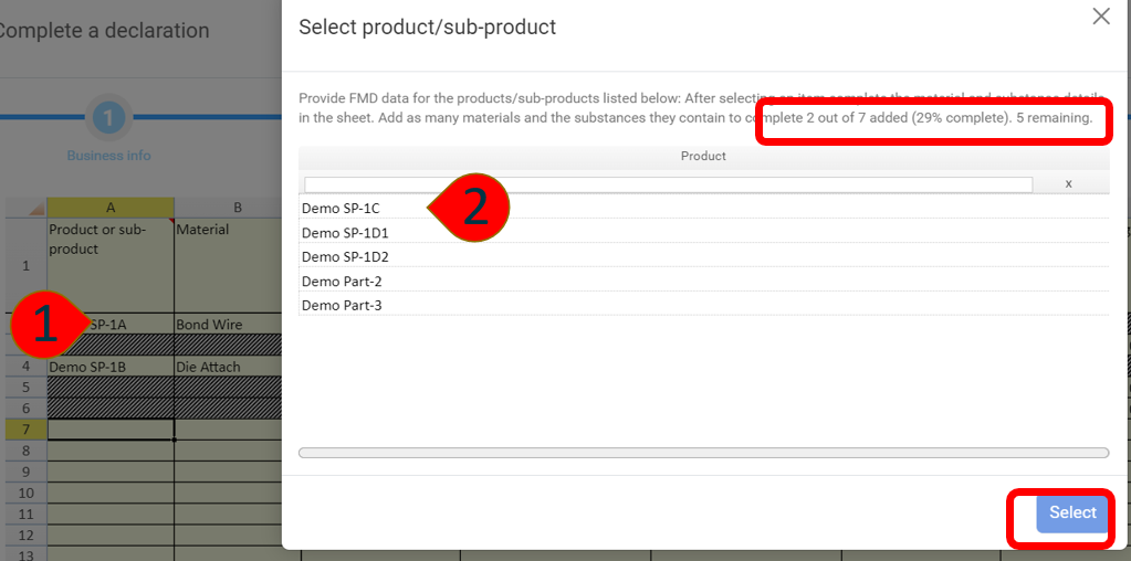 A pop-up window will appear listing all off the Products and Sub-Products that require material and substance data.