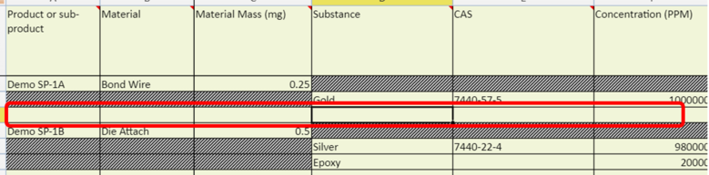 If you want to add an additional chemical to an existing Product or Sub-Product, click the cell beneath the existing Substance field and pick Add row.