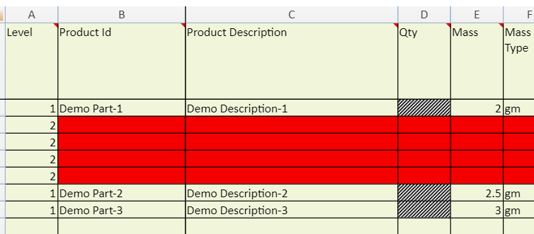 A new row will be added below Demo Part-1 at Level 2 with mandatory fields highlighted in red.