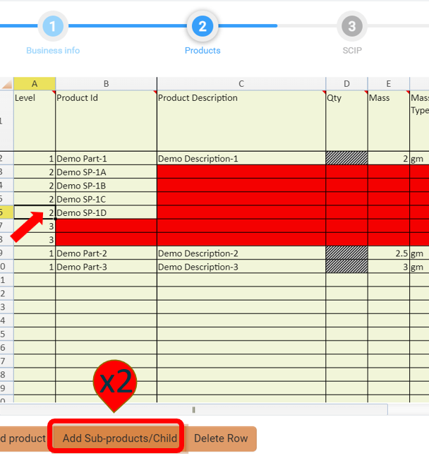 1 (one) Sub-Product Demo SP-1D will have 2 (two) Sub-Products and those will have materials and substances